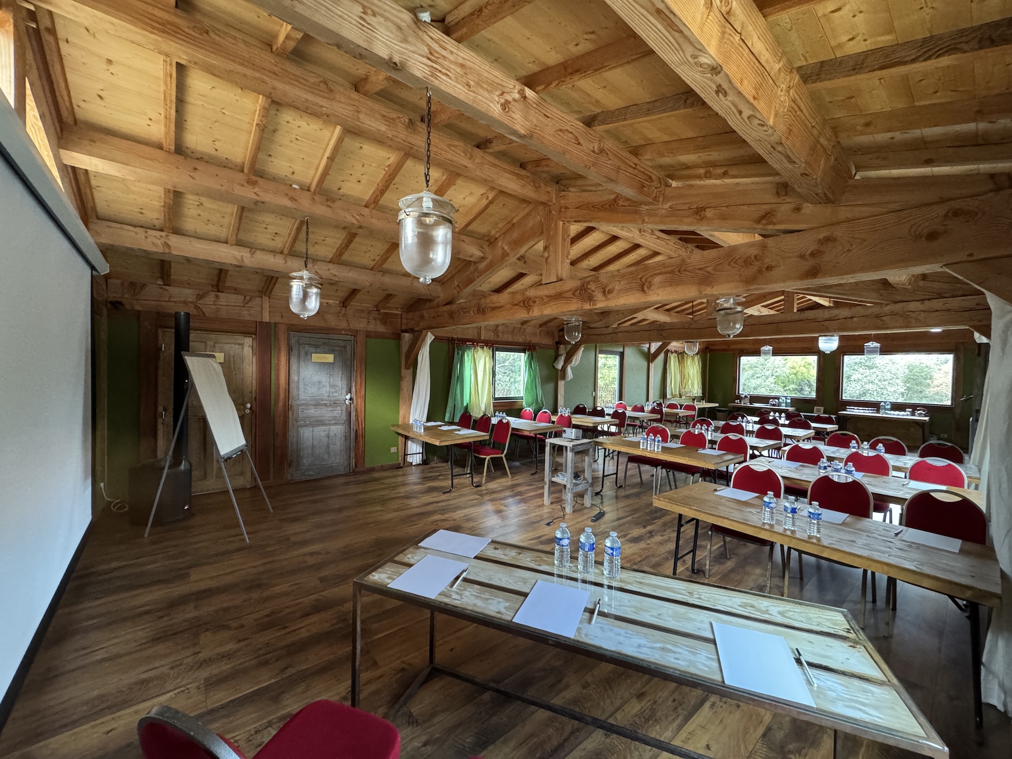 - La Grange (100 m²) : Un espace climatisé à l'orée du bois, baigné de lumière naturelle grâce à ses larges ouvertures. Idéal pour une plénière ou un lancement de produit jusqu'à 120 personnes.